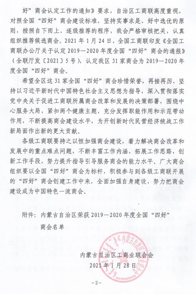 工商聯(lián)所屬商會(huì)是做好民營(yíng)經(jīng)濟(jì)統(tǒng)戰(zhàn)工作的重要組織依托。為深入推進(jìn)工商聯(lián)所屬商會(huì)改革發(fā)展,持續(xù)深化“四好”商會(huì)建設(shè),全國(guó)工商聯(lián)組織開(kāi)展了20192020年度全國(guó)“四好”商會(huì)認(rèn)定工作,經(jīng)過(guò)嚴(yán)格的推薦、初審以及專(zhuān)家評(píng)審組評(píng)審等環(huán)節(jié),日前認(rèn)定了1478家全國(guó)“四好”商會(huì)。內(nèi)蒙古農(nóng)牧業(yè)產(chǎn)業(yè)化龍頭企業(yè)協(xié)會(huì)榮獲全國(guó)“四好”商會(huì)榮譽(yù)稱(chēng)號(hào)。
