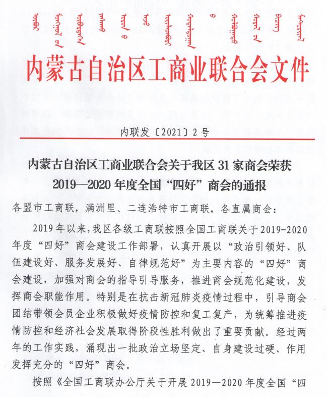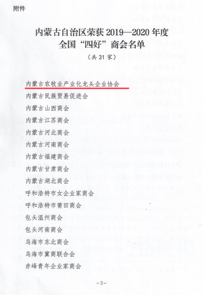 標(biāo)題:喜報(bào)!內(nèi)蒙古農(nóng)牧業(yè)產(chǎn)業(yè)化龍頭企業(yè)協(xié)會(huì)榮獲全國(guó)“四好”商會(huì)榮譽(yù)稱(chēng)號(hào)