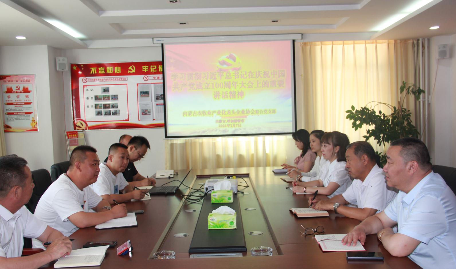 2021年7月7日上午,內(nèi)蒙古農(nóng)牧業(yè)產(chǎn)業(yè)化龍頭企業(yè)協(xié)會(huì)聯(lián)合黨支部書(shū)記李陽(yáng)主持召開(kāi)“學(xué)習(xí)貫徹習(xí)近平總書(shū)記在慶祝中國(guó)共產(chǎn)黨成立100周年大會(huì)上的重要講話精神”座談會(huì)。協(xié)會(huì)會(huì)長(zhǎng)周勇,執(zhí)行會(huì)長(zhǎng)林永亮,執(zhí)行秘書(shū)長(zhǎng)呼群等所有在呼黨員干部參加會(huì)議。