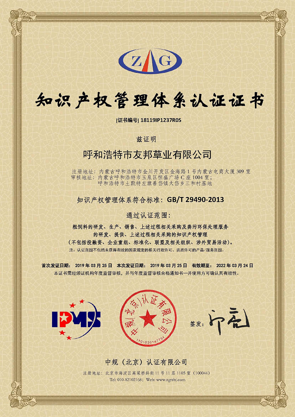 呼和浩特市友邦草業(yè)有限公司于2019年3月25日正式獲得由中規(guī)(北京)認(rèn)證公司頒發(fā)的《知識(shí)產(chǎn)權(quán)管理體系認(rèn)證證書》(證書編號(hào):18119IP1237R0S),這標(biāo)志著友邦草業(yè)在知識(shí)產(chǎn)權(quán)創(chuàng)造、運(yùn)用、管理和保護(hù)方面全面邁入國內(nèi)領(lǐng)先水平。