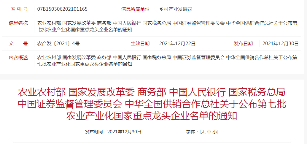 企業(yè)名稱:農(nóng)業(yè)農(nóng)村部 國家發(fā)展改革委 商務(wù)部 中國人民銀行 國家稅務(wù)總局 中國證券監(jiān)督管理委員會 中華全國供銷合作總社關(guān)于公布第七批農(nóng)業(yè)產(chǎn)業(yè)化國家重點龍頭企業(yè)名單的通知