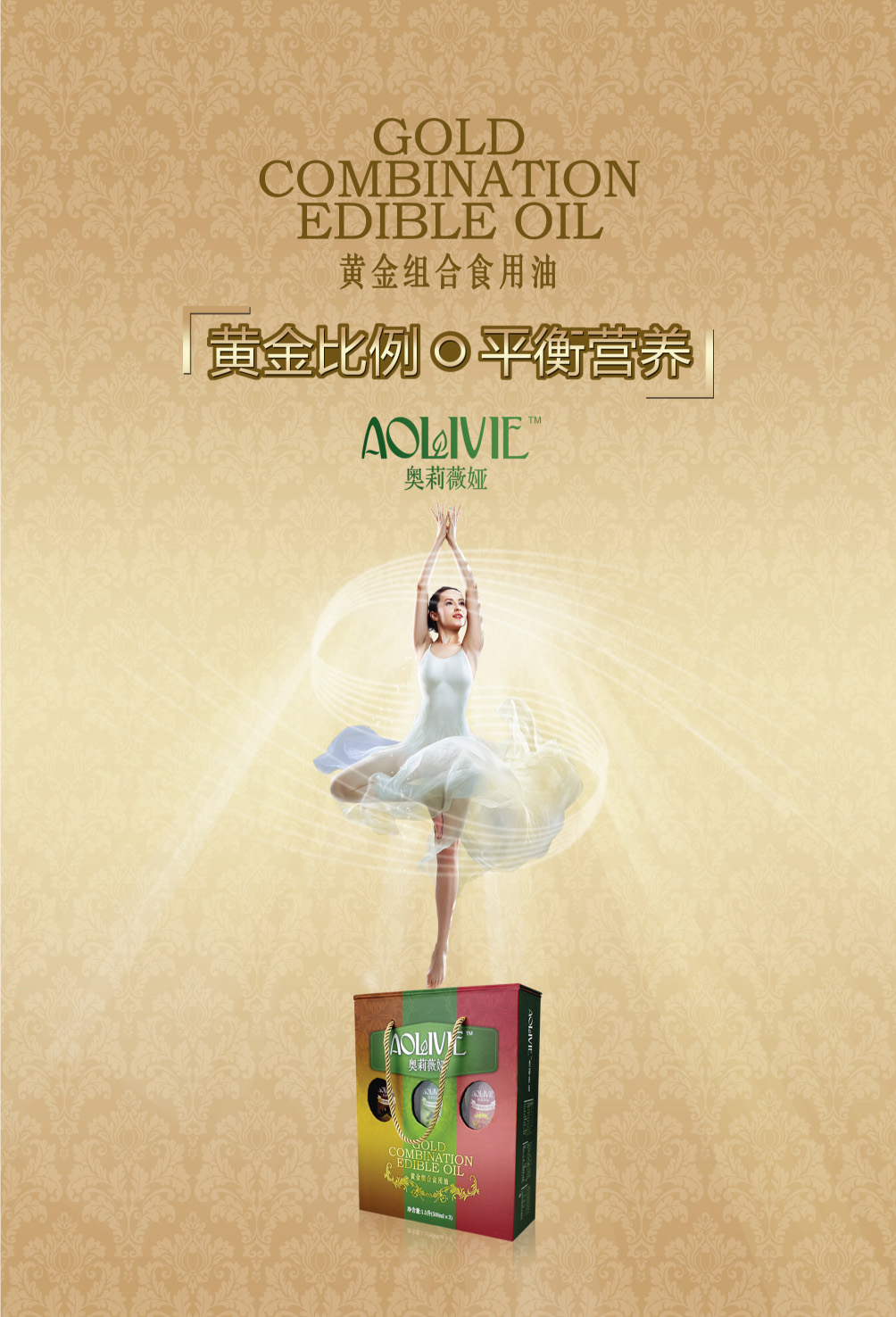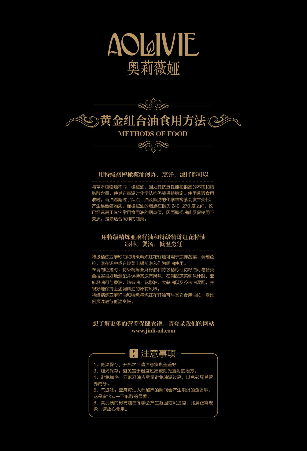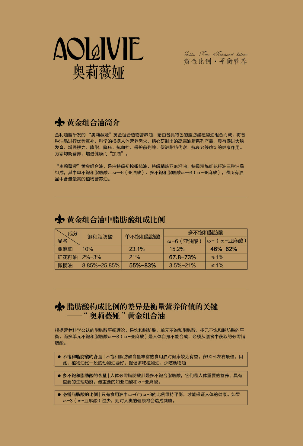 金利油脂(蘇州)有限公司研發(fā)的:“奧莉薇婭黃金組合植物營養(yǎng)油,有各具特色的脂肪酸植物油組合而成,將各種油品進(jìn)行優(yōu)勢互補,科學(xué)的根據(jù)人體營養(yǎng)需求,精心研制出的高端油脂系列產(chǎn)品。具有促進(jìn)大腦發(fā)育/增強視力/降脂/降血壓/抗血栓/保護(hù)前列腺/促進(jìn)脂肪代謝/抗衰老等良好的保健作用。為您均衡營養(yǎng)/增強體質(zhì)而“加油”?!皧W莉薇婭黃金組合油,是有特級初榨橄欖油/特級冷榨亞麻籽油/特級精煉紅花籽油三種油品組成,其中單不飽和脂肪酸/α—亞麻酸和亞油酸,是所有植物油中含量最高植物營養(yǎng)油。